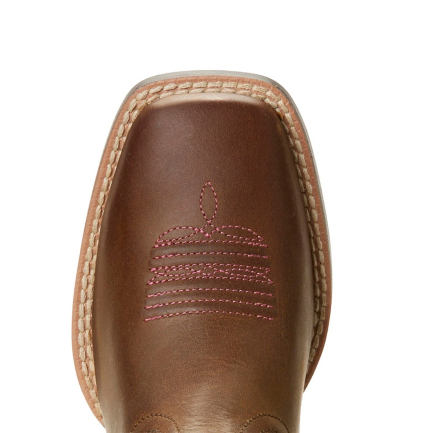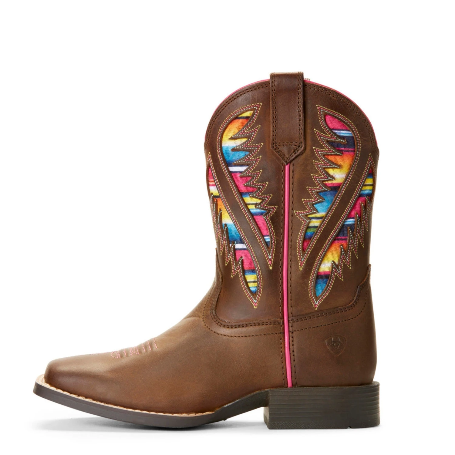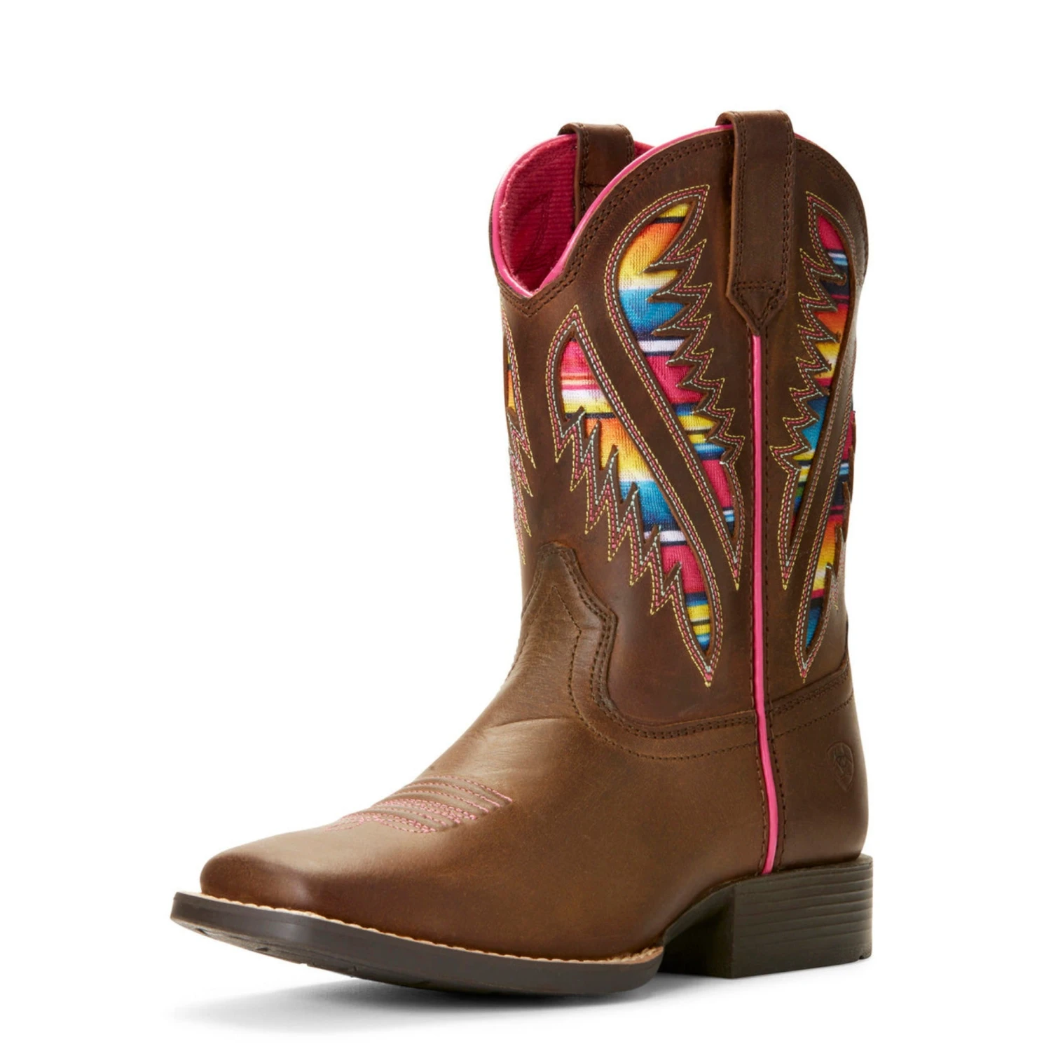 These Ariat kid’s boots are so fun! They features serape ventTEK underlays on the shaft while the toe is a distressed brown color! VentTEK technology allows more breathability than a traditional cowboy boot. The boot also featues a booster bed that can be taken out as feet grow so boots can last longer!